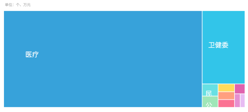 本月,全国医疗设备领域招投标项目中,医疗以1490个项目占据采购数量榜首,卫健委、民政紧随其后,分别为243个、15个,前3类客户采购量占全部项目数量的90.10%。各类客户采购项目数量分布如下图: