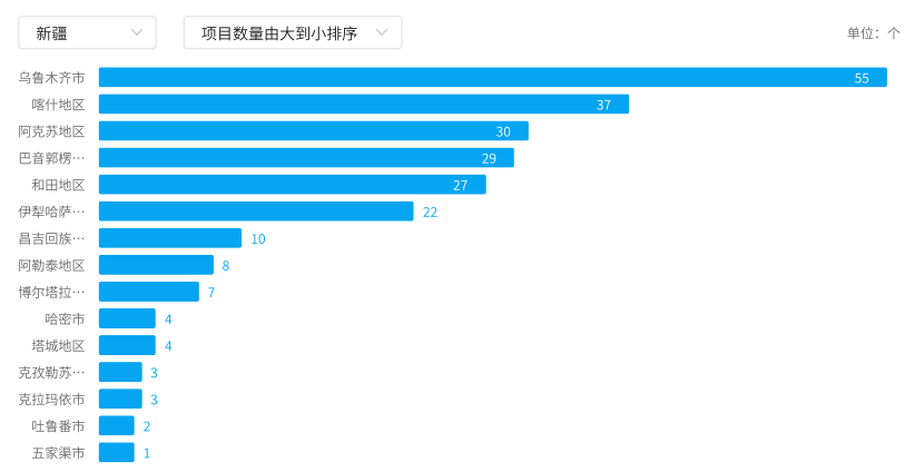 本月,新疆医疗设备领域招投标项目数量方面,乌鲁木齐市、喀什地区、阿克苏地区中标项目较多,分别达到55个、37个、30个,前3个城市占新疆医疗设备领域项目数量的50.21%。