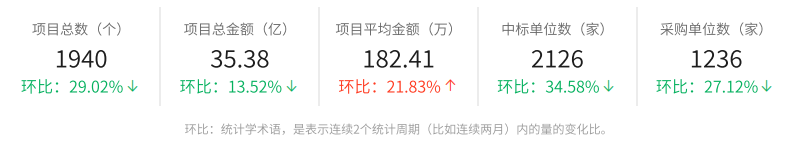 市场主体方面,本月中标企业总数为2126家,环比上月下降34.58%;完成招标采购的采购单位总数1236家,环比上月下降27.12%;