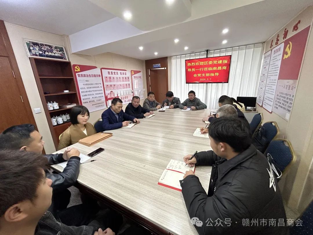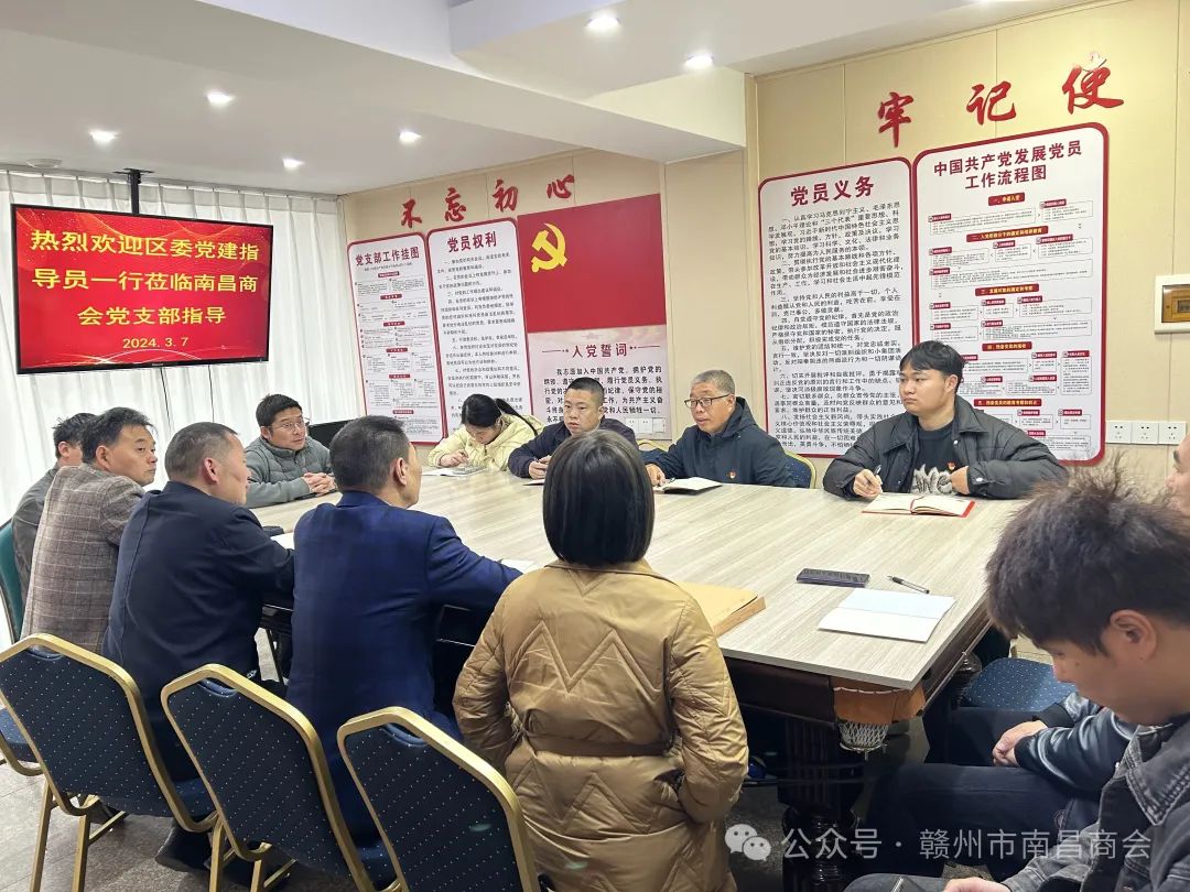 3月7日上午,区委党建指导员蔡小兵、曾德锋等人莅临商会党支部指导党建工作,一行人首先实地参观了商会办公场和荣誉墙,随后召开了工作座谈会。商会党支部书记万国华,副书记熊建辉,组织委员徐平军和部分党员参加了座谈会,会长万德龙应邀也参加了座谈会。