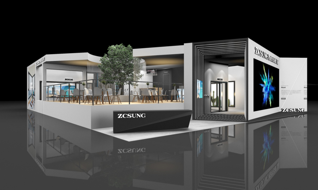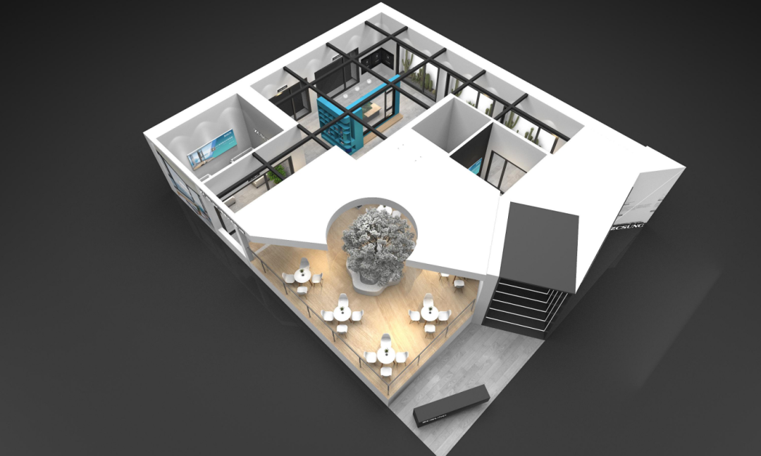 展台设计采用简洁、流畅的线条,打造出极具现代感的展台结构。在展台的中心位置设置一棵树,象征人与自然的和谐共生,将自然元素融入到现代设计中,传递出环保、生态和绿色生活的理念。