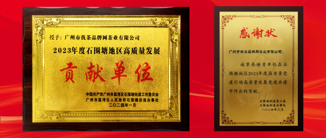 找找茶荣获石围塘地区2023年度高质量党建引领高质量发展党建共建突出贡献单位的感谢状!