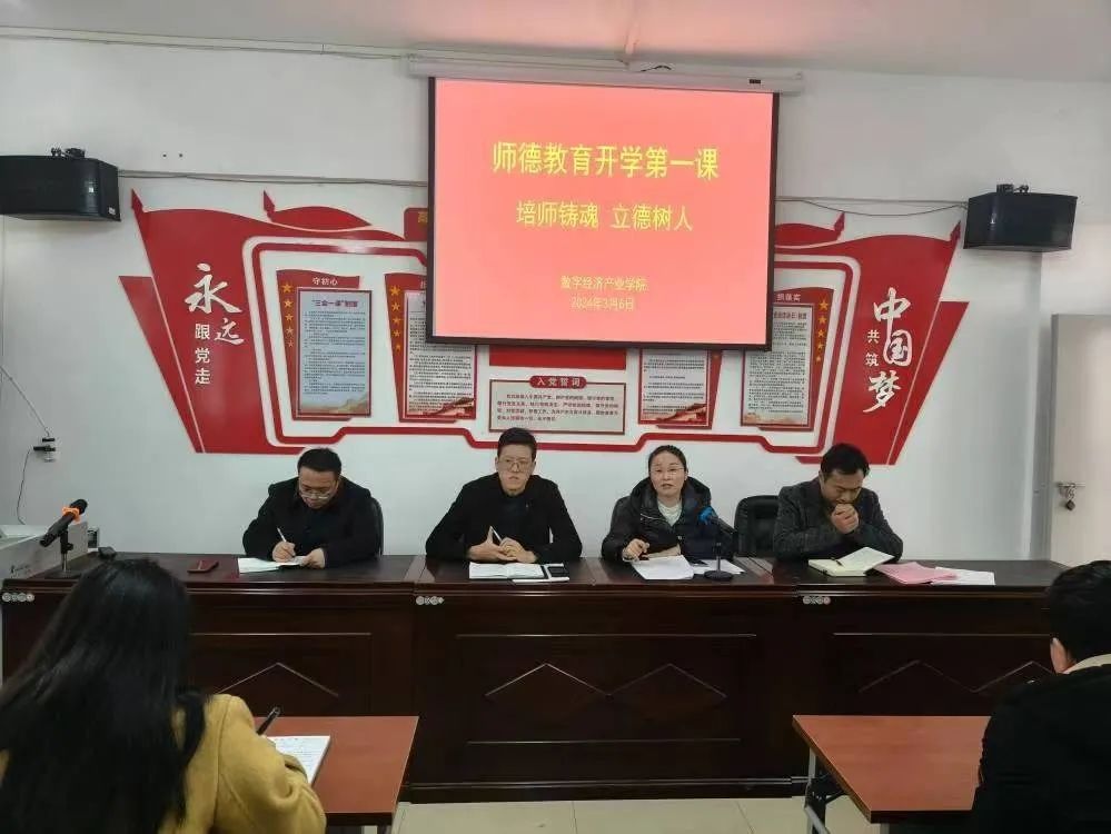 为进一步加强师德师风建设,规范从教行为,践行育人使命,3月6日,数字经济产业学院在B201会议室召开以“培师铸魂,立德树人”为主题的师德教育开学第一课专题会议。此次会议由院长谭文武主持,党总支书记张文凤、副院长朱伙军、党总支副书记郭伟光及全体教师参加。