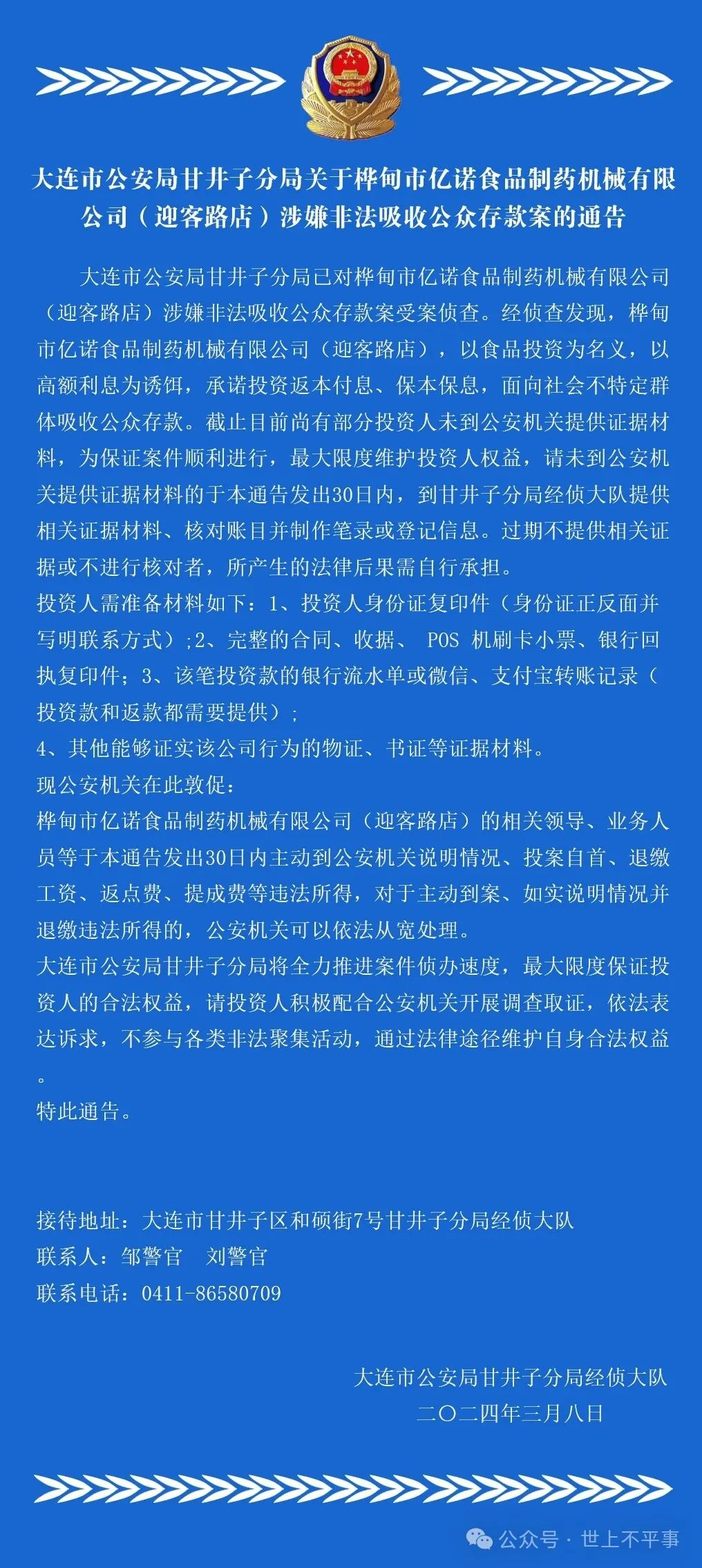 2024年3月8日,大连市公安局甘井子分局对外发布了关于桦甸市亿诺食品制药机械有限公司(迎客路店)涉嫌非法吸收公众存款案的通告。具体如下: