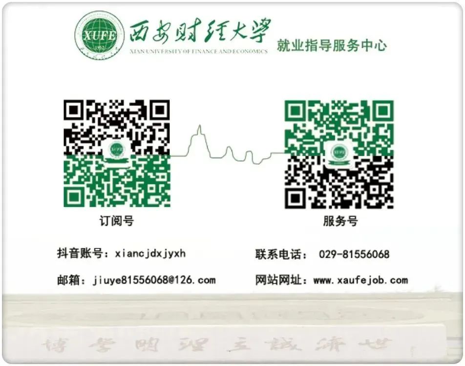 本微信公众号系西安财经大学就业指导服务中心信息发布平台,仅提供信息分享服务,发布所有信息由用人单位提供或网络搜集,如涉及侵权,请联系我们删除。广大毕业生请注意信息的真实性及安全性,如发现问题,请及时向我们举报。
