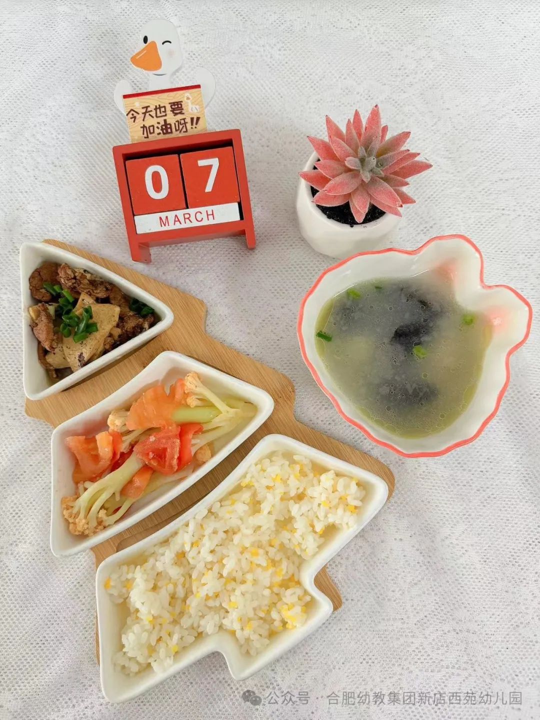 玉米糁米饭、素鸡烧肉、番茄炒菜花、浓香鲫鱼堡