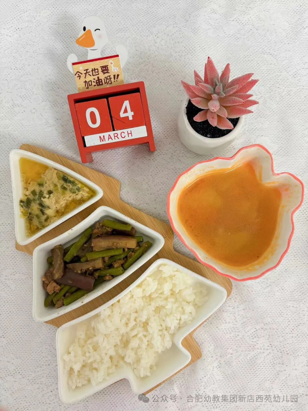 香米饭、银鱼蒸蛋、肉沫豆角茄条、罗宋汤