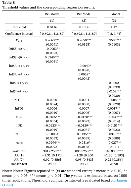 表8将技术创新视为临界变量,描述了相关的临界结果。具体地说,所有模型的Wald统计量的p值在1%的显著性水平上都是显著的,否定了原来没有临界效应的假设。因此,产业结构调整对能源效率有明显的非线性影响,并且在技术创新的约束下是非线性的。同时,表7还报告了门槛回归结果。首先,AR(2)检验的p值超过显著性水平,表明不存在序列自相关问题。其次,所有列的Hansen统计量都验证了所构建的工具变量的有效性。总之,动态PTR结果是可信的。