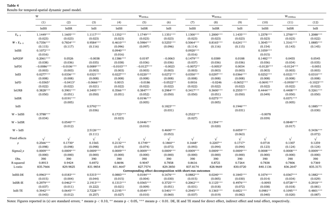 其次,三个变量(即产业结构高级化、产业结构合理化、产业结构复合系统)的空间滞后系数(WnXnt)也显著为正,排除了空间权重矩阵W800km下W×lnISS的系数。考虑到空间回归产生的参数不能直接解释为回归因子对结果变量的边际效应,因此本文通过偏导数对基本参数进行分解,如表4所示。分解结果与回归结果基本吻合。具体来说,三个利益指标的导出系数都显著为正(W800km下的W×lnISS除外)。这种情况一方面凸显了产业结构高级化、产业结构合理化和产业结构复合系统对当地能源效率具有显著的正向影响,同时也具有正向的空间溢出效应。结果表明,调整和优化产业结构对发展国家层面的能源效率非常重要。当产业结构得到更好的设计和发展时,产业结构高级化水平越高,能源效率越高。可能的解释是,基础设施服务部门揭示了产业结构向服务型产业部门的转变。这一过程表现在两个方面。一是新兴工业部门取代老工业基地,二是低碳和绿色技术取代传统技术。值得注意的是,这两个方面有助于持续实现高质量的绿色发展和改善环境效益。此外,这也有助于实现节能与污染减排的"双赢"。