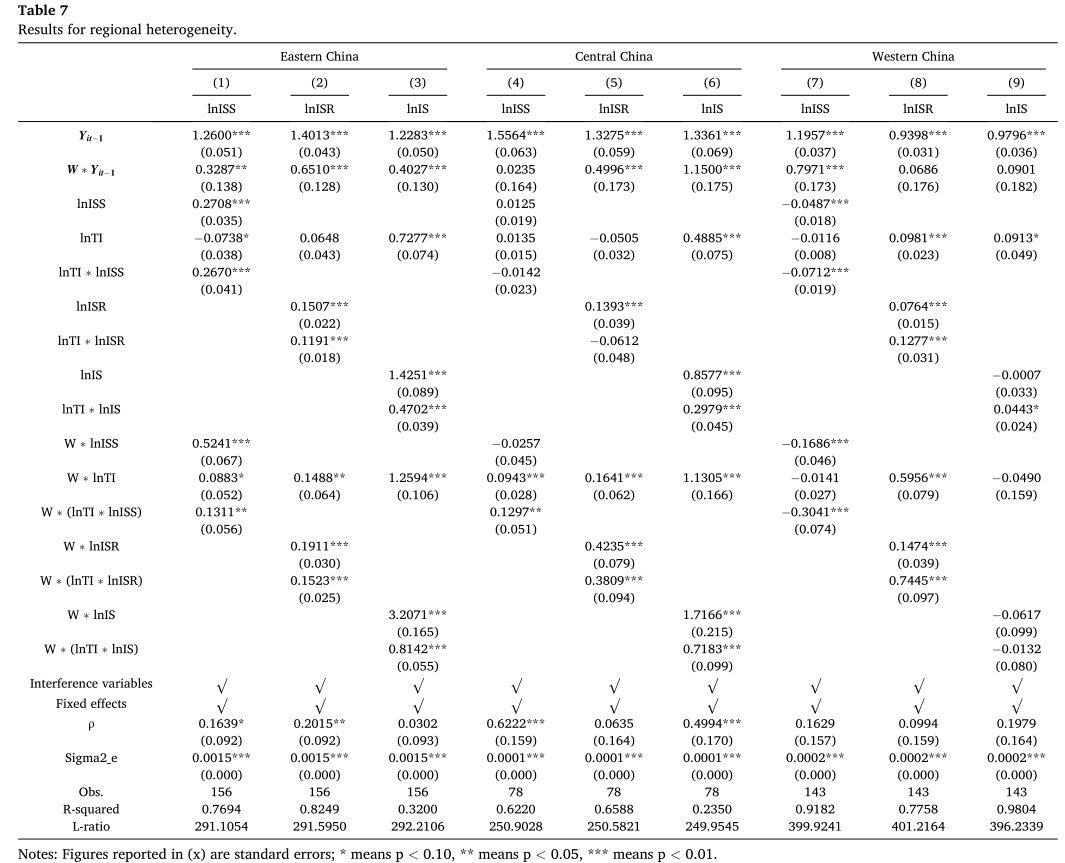 本研究在以下几个方面对相关文献有所贡献。首先,根据产业结构调整的定义,产业结构调整被分解为产业结构高级化(ISS)和产业结构合理化(ISR)。具体而言,产业结构优势化是指一国的产业结构从低层次向高层次的不断提升,可用来衡量产业结构是否在向高级化发展。产业结构合理化指的是投入结构和产出结构的耦合度和协调度。为了弥补文献空白,本文构建了一个衡量省际产业结构复合系统(IS)的综合指数。以往的研究未能考虑产业结构调整与能源效率之间的过渡机制。例如,需要进一步探讨技术创新在产业结构调整-能源效率关系中扮演何种角色的问题,从而从综合的视角了解产业结构调整和技术创新对能源效率的互动效应。其次,值得注意的是,基础设施服务区可能产生显著的空间溢出效应,这表明基础设施服务区不仅在当地的环境教育中发挥作用,而且对邻近地区也有一定的影响。例如,地方政府会学习和模仿邻近地区实施的政策,以加快基础设施服务协定的实施,推进技术倡议,从而引起政策的空间溢出效应。因此,相邻地区广泛采纳和实施类似政策可能会加强空间溢出效应。在这种情况下,需要一个同时考虑时间和空间因素的空间计量经济模型来捕捉基础设施服务协议对能源效率的影响。这些都是与Zhu等人的开创性工作不同的主要创新之处。第三,中国在经济绩效方面也存在地区间的发展差距。东部地区获得了经济发展的先发优势。因此,东部地区的经济实力、基础设施建设和技术创新水平都强于中西部地区。因此,研究区域异质性也很有必要。