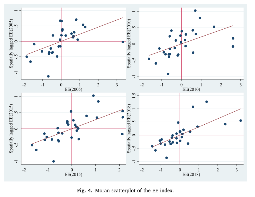 本文通过绘制莫兰散点图进一步确定能源效率指数的集聚模式,如图4所示。结果表明,2005年、2010年、2015年和2018年,中国大部分省份都分布在第一和第三象限。这一观察结果证明了与能源效率有关的H-H或L-L集聚分布特征。同时,位于第一和第三象限的省份分别有26个、23个、22个和22个,在2005年、2010年、2015年和2018年分别占86.7%、76.7%、73.7%和73.7%。此外,高集聚省份主要包括北京、山东、江苏、浙江和福建。这些省份在第一象限中保持不变,表明这些省份的集聚程度稳定。此外,其他象限的省份也基本保持不变,多年来波动相对较小。例如,内蒙古、陕西、宁夏和甘肃主要分布在第三象限。总之,省际环境经济发展的特点是空间集聚相对稳定。但是,由于西部地区与东部地区在环境教育方面往往存在空间相关性,因此西部地区很难赶上东部地区。