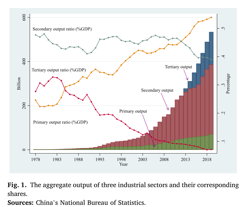 由于能源枯竭和全球气候变化,节约能源和减少污染日益受到学术界和政策制定者的关注。提高能源效率是改善环境质量和减少能源消耗的有效途径,这一点不足为奇。中国作为世界上最大的碳排放国和最大的能源消费国,正处于工业化加速发展阶段。然而,中国经济的快速扩张仍然在很大程度上依赖于过度投资化石燃料供应的经济结构。因此,积极推动产业结构调整(ISA)有望在环境保护和能源节约之间实现所谓的"双赢"。基于产业演化理论,产业结构调整意味着产业向更高级结构转型的过程,以及提高投入要素的利用效率。如图1所示,第一、二、三产业的GDP占比已从1978年的28%、48%、25%转变为2019年的7%、39%、54%,其中第三产业的相应占比在2012年已增至50%以上。直观地看,中国的基础设施服务业与佩蒂-克拉克定律不谋而合:即社会人口从第一产业向更复杂的产业(第二产业—第三产业)的就业转型。