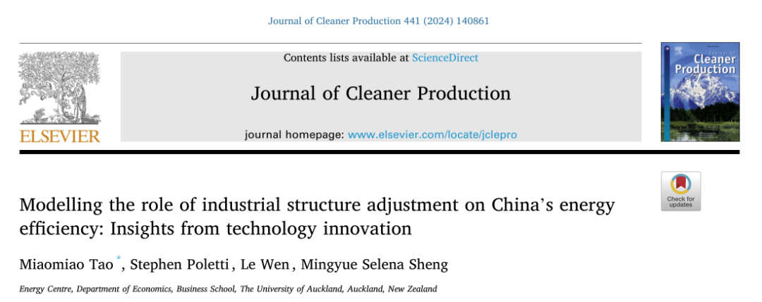 参考文献:Miaomiao Tao, Stephen Poletti, Le Wen, Mingyue Selena Sheng,Modelling the role of industrial structure adjustment on China's energy efficiency: Insights from technology innovation, Journal of Cleaner Production, Volume 441, 2024, 140861, ISSN 0959-6526.