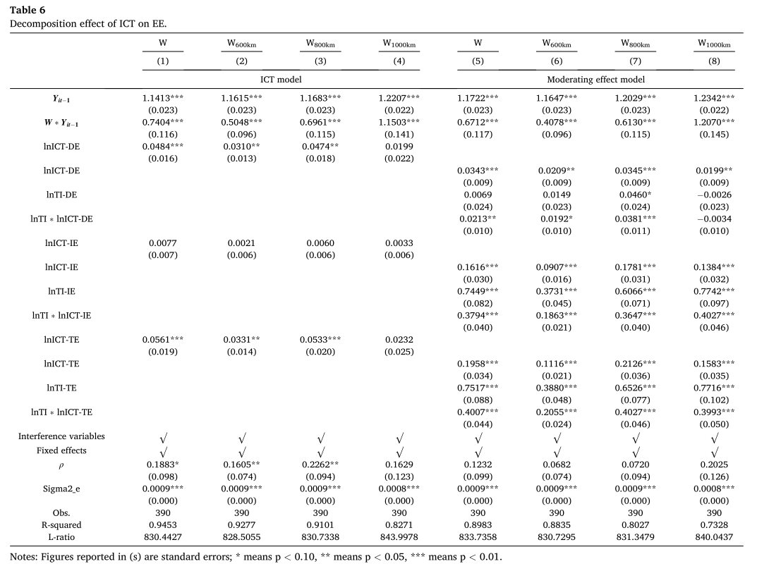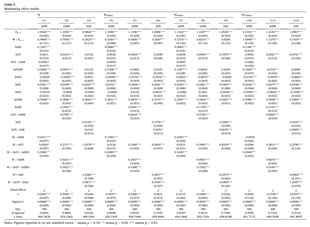 值得注意的是,信息和通信技术往往表现出显著的集聚特征。信息和通信技术的集聚有望通过知识共享效应对当地和周边地区的能源效率改善产生有利影响。然而,信息和通信技术对邻近地区环境教育的积极影响较弱,这可能是由于溢出效应较弱。也就是说,信息和通信技术集聚的空间溢出效应并不明显。此外,中国的信息通信技术能力分布并不均衡。此外,鉴于技术创新的重要作用,地方政府可能会将更多的财政资源用于支持技术创新。丰富的资金支持加上强大的创新能力和优惠政策,将有力地促进绿色发展。