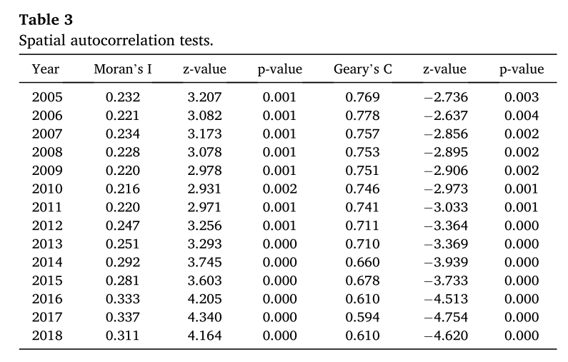 本文采用Moran's I和Geary's C检验能源效率指数是否存在空间自相关。表3显示,能源效率的两类统计量均为正,通过了1%的显著性水平检验,表现出显著的空间自相关性。具体而言,Moran's I估计值先下降后趋于上升,尤其是在2012年之后(即中国进入新时代的时间点)。这意味着省际经济增长指数表现出明显的空间依赖性,而且这种特殊效应随着时间的推移有增强的趋势。此外,所有Geary's C的估计值都没有超过1,这反过来又支持了调查期间中国能源效率指数的正空间自相关性。总之,空间模型的应用是必要的。