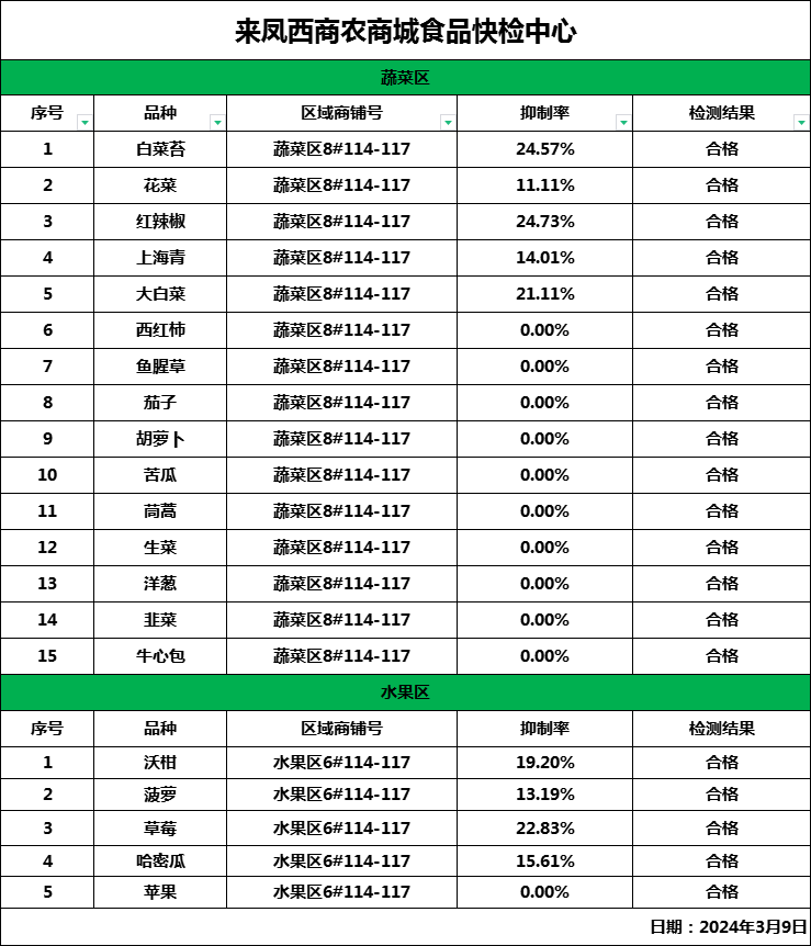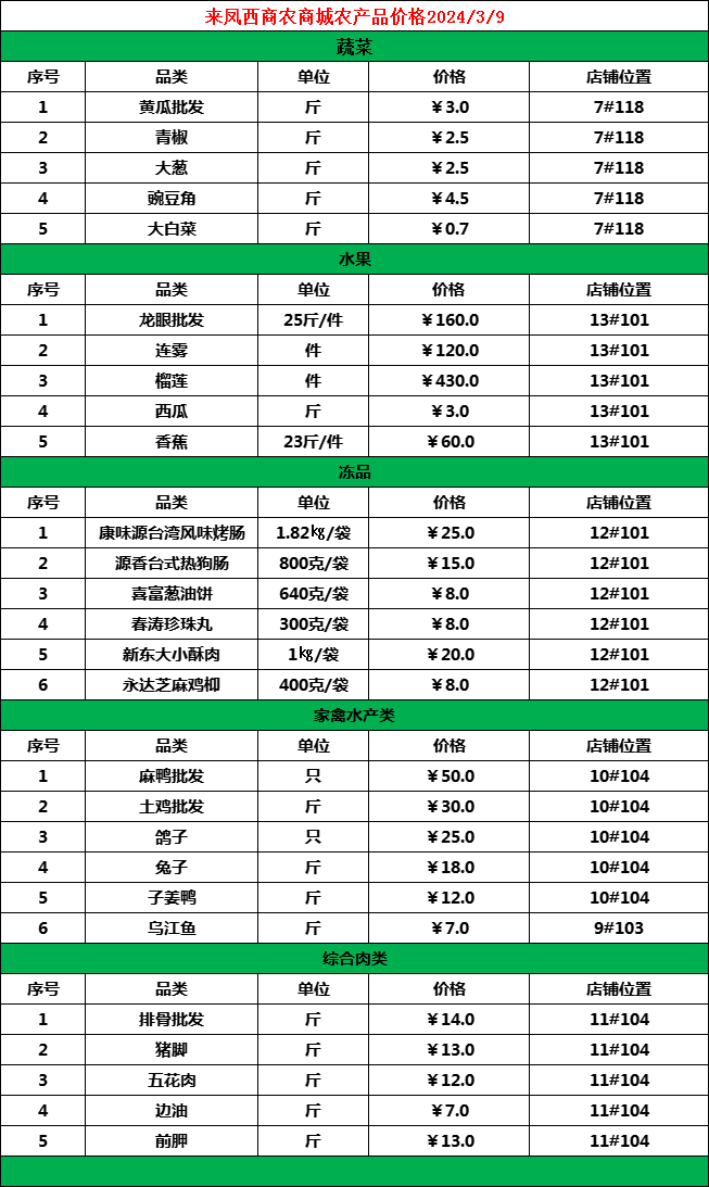 据农业农村部监测,3月8日“农产品批发价格200指数”为126.24,比前天上升0.07个点,“菜篮子”产品批发价格指数为127.90,比前天上升0.07个点。截至昨日14:00时,全国农产品批发市场猪肉平均价格为20.10元/公斤,比前天下降0.3%;牛肉69.70元/公斤,比前天上升0.5%;羊肉64.30元/公斤,与前天持平;鸡蛋8.47元/公斤,比前天上升0.2%;白条鸡17.72元/公斤,比前天下降0.6%。重点监测的28种蔬菜平均价格为5.29元/公斤,比前天下降0.9%;重点监测的6种水果平均价格为7.33元/公斤,比前天下降0.7%。鲫鱼18.14元/公斤,比前天下降0.2%;鲤鱼14.10元/公斤,比前天下降0.6%;白鲢鱼8.91元/公斤,与前天持平;大带鱼42.17元/公斤,比前天上升4.4%。