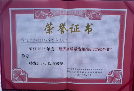 3月7日下午,合适佳公司参加2024年呼伦贝尔经济技术开发区工作会议,并荣获2023年度“经济高质量发展突出贡献企业”称号。