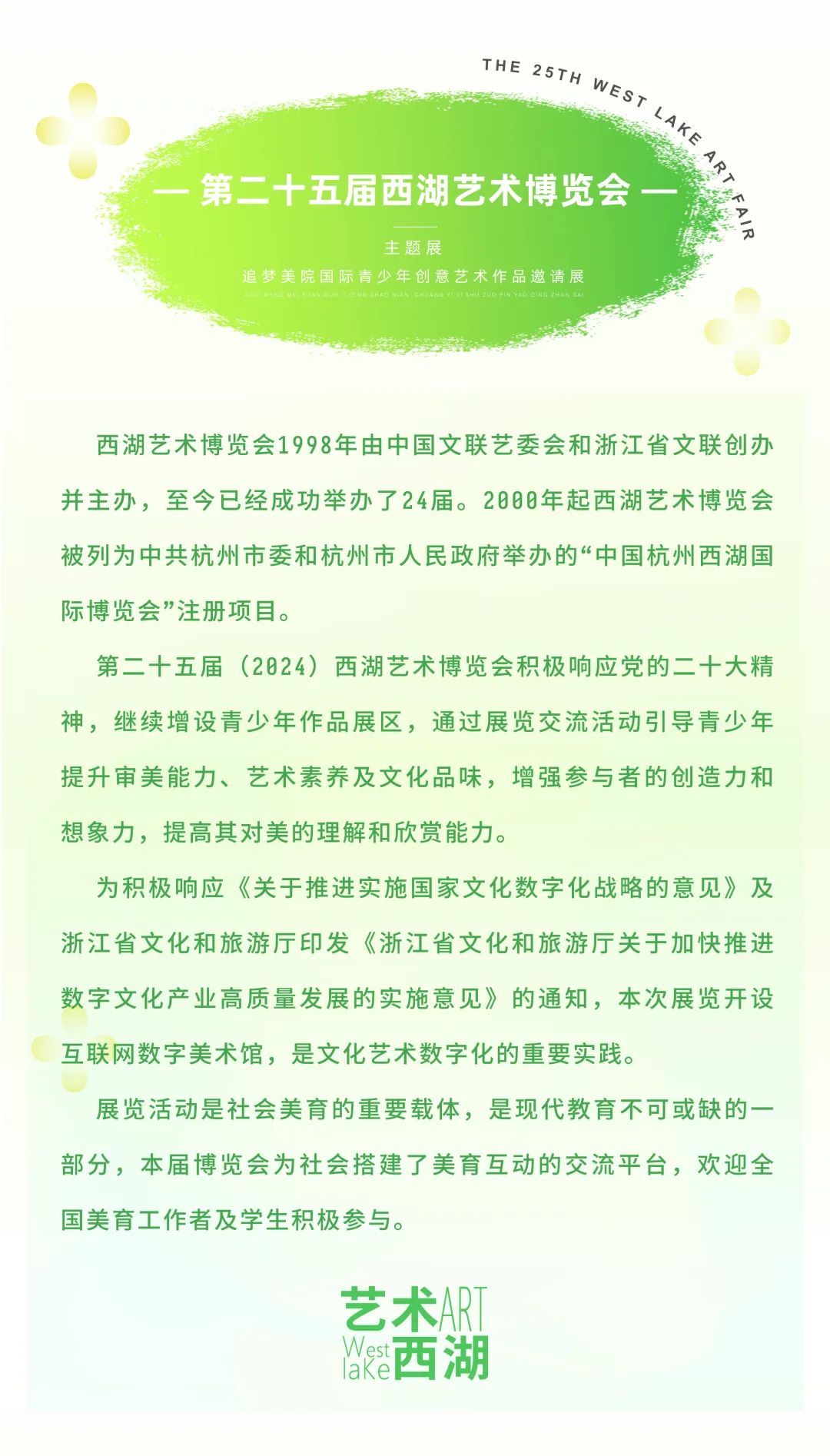 第二十五届西湖艺术博览会主题展:追梦美院——国际青少年创意艺术作品邀请展全国征稿!