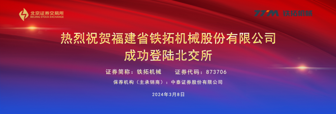 3月8日,铁拓机械(代码:873706 )正式在北交所上市,成为第245家北交所公司,也是龙年北交所第一只新股。铁拓机械上市首日涨幅翻倍,盘中一度触发涨临停,最高狂飙逾198%,至收盘上涨140%,报16.06元/股,最新市值为14.3亿元,全天换手率为95.54%,总成交额为3.39亿元。