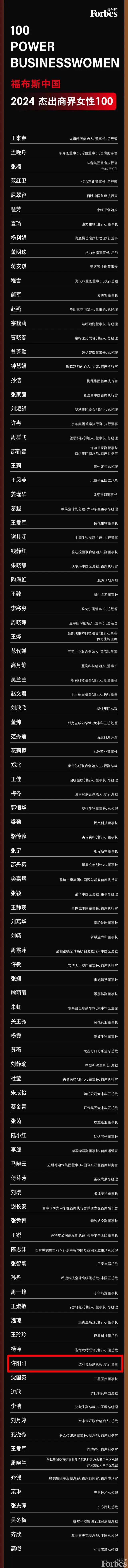 福布斯中国2024杰出商界女性100榜单以国内上市公司女性管理者、入选“福布斯全球2000强”的跨国公司在华女性领导人,以及独角兽企业女性创始人为研究对象,通过对候选人所领导业务经营业绩、资本市场表现、市场规模、行业影响力、创新力等数据分析,从上千位候选人中遴选出最终100人。