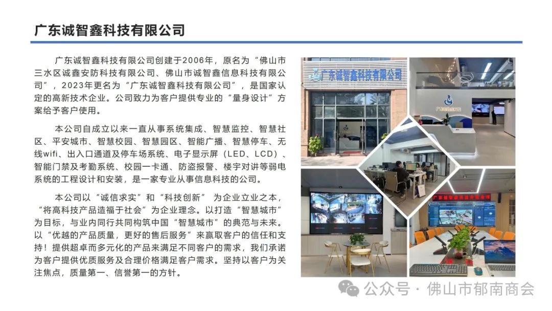 广东诚智鑫科技有限公司创建于2006年,原名为“佛山市三水区诚鑫安防科技有限公司、佛山市诚智鑫信息科技有限公司”,2023年更名为“广东诚智鑫科技有限公司”,是国家认定的高新技术企业。公司致力为客户提供专业的“量身设计”方案给予客户使用。