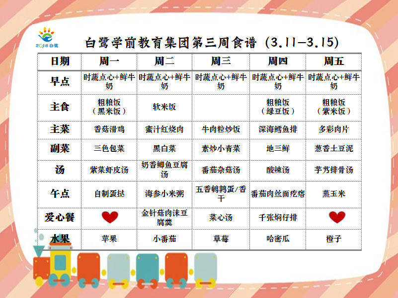 【白鹭·保健】美好“食”光|白鹭学前教育集团第三周食谱2024.3.11-3.15