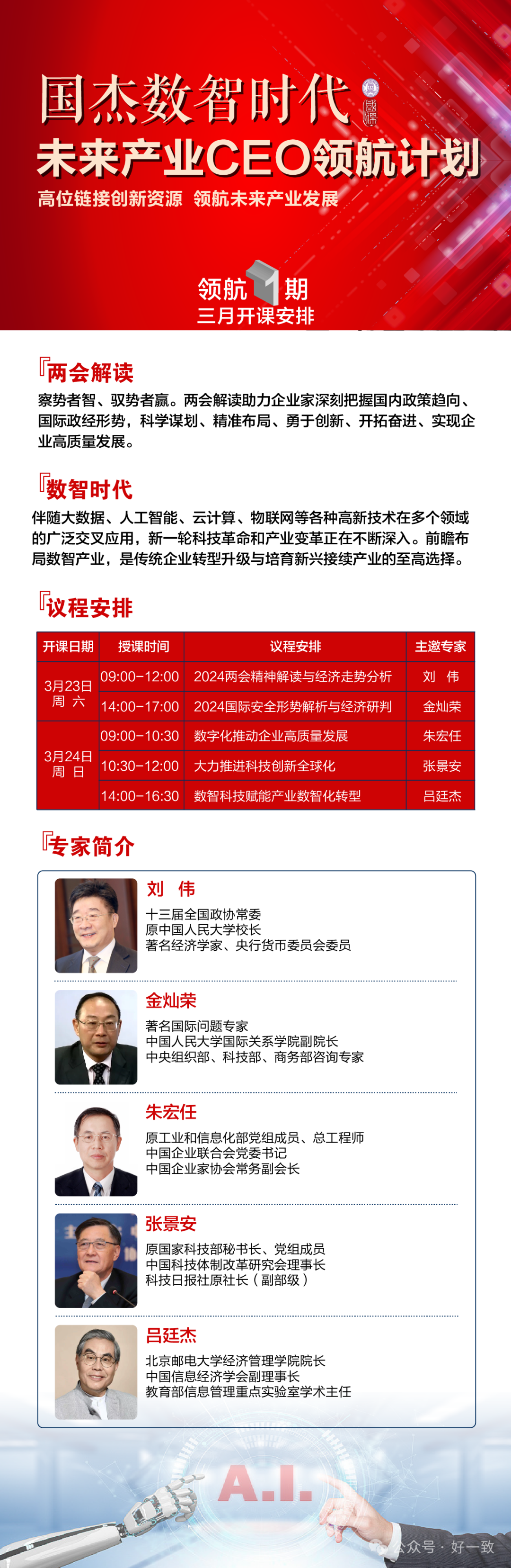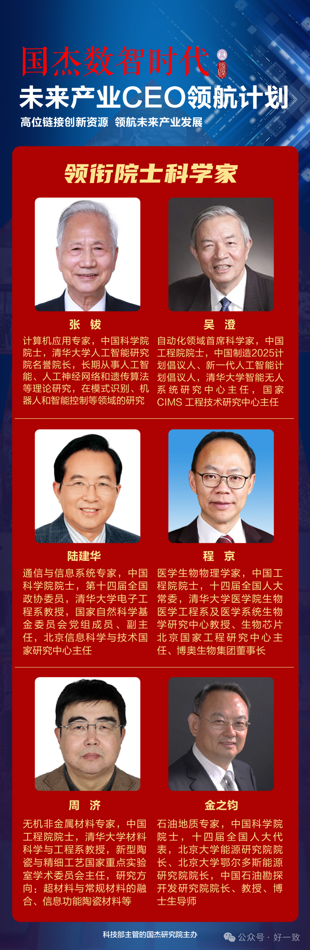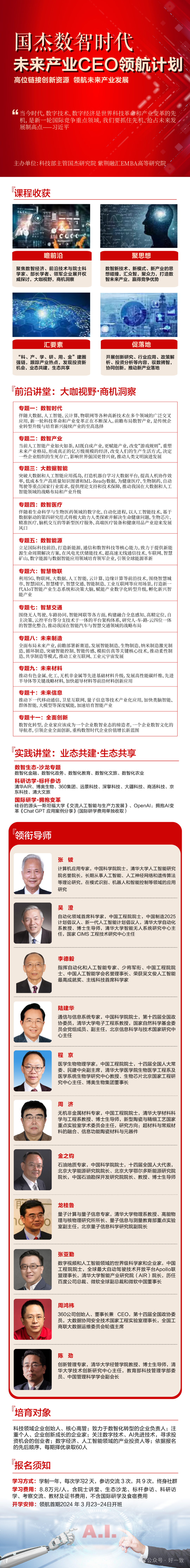 “AI改变世界,数智引领未来”!从芯到云,从网到端,数智产业链上下游正发生着急剧的变革。趋势是什么?挑战有哪些?浪潮之巅,机遇如何把握?“2024国杰数智时代未来产业CEO领航黄埔高级研修班”积极响应国家号召,盛邀六位院士科学家领衔导师团队,在“人工智能、 数智产业、数智医疗、数智能源、未来材料、未来信息、未来制造、智慧交通、智慧物联领域集智攻关、共建生态!高位链接创新资源,领航未来产业发展!黄埔一班开学3月23日-24日,按照报名顺序先后,审核招生58人!报名申请13520713771