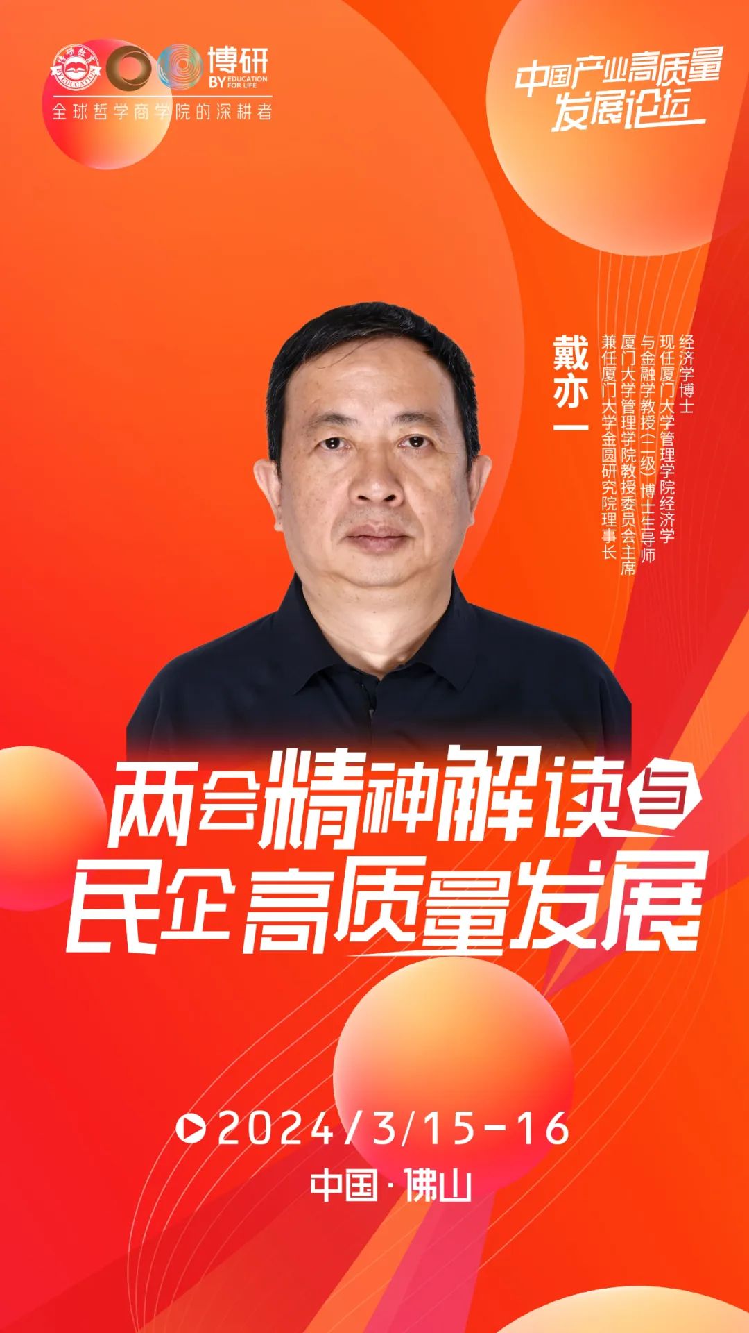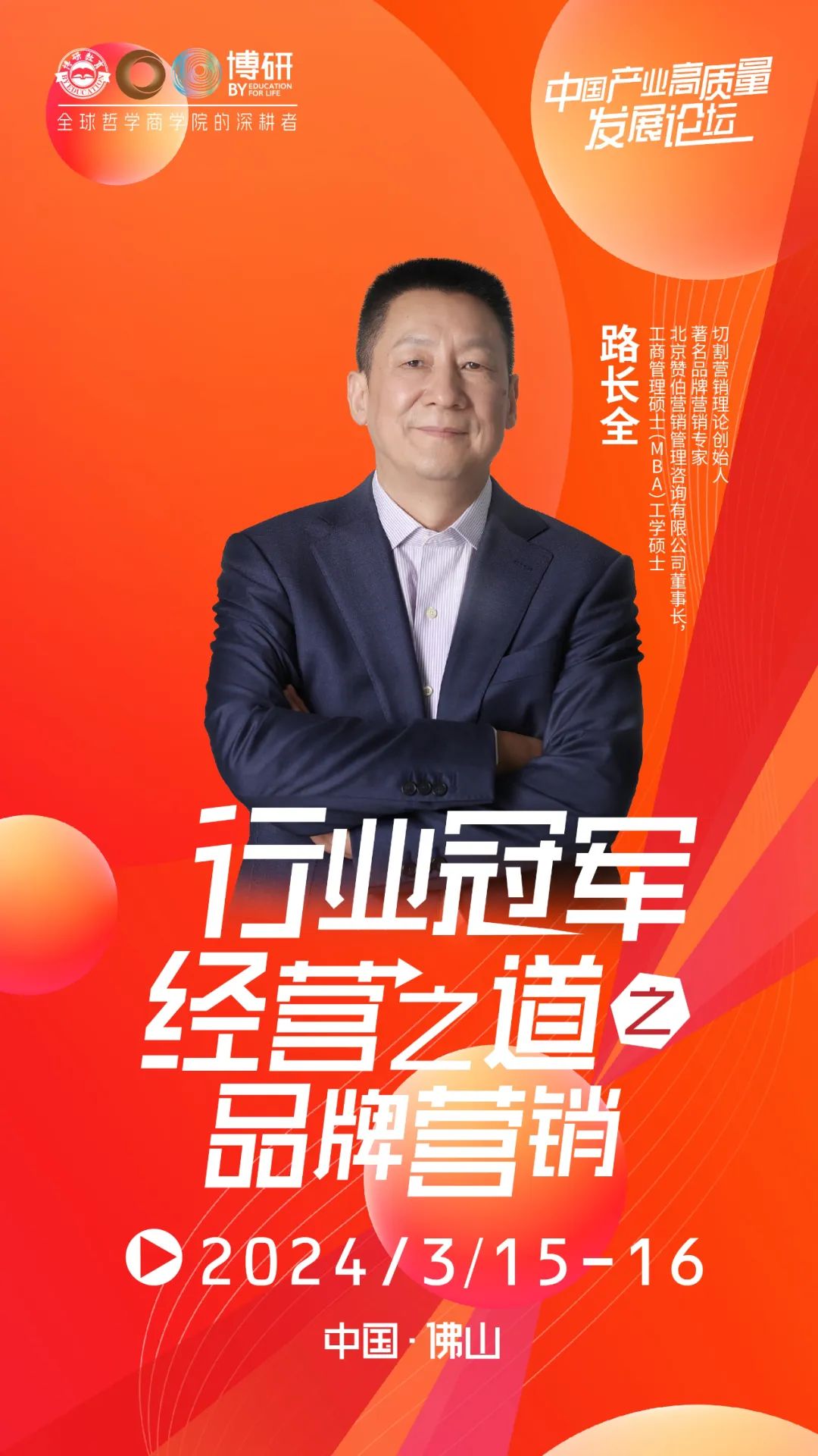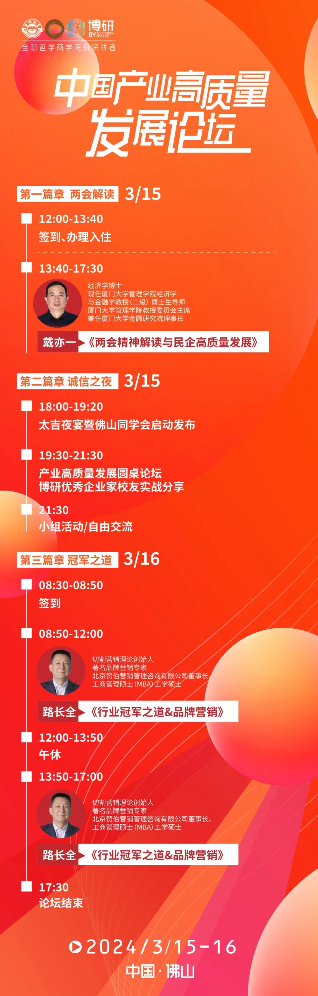 为此,2024年3月15-16日,在全国两会圆满落幕之际,博研哲学商学院特别邀请厦门大学博士生导师戴亦一教授,中国营销泰斗、著名品牌营销专家路长全老师以及博研优秀校友在广东·佛山为企业家们带来《两会解读与产业高质量发展》《行业冠军之道-品牌营销》等系列产业高质量发展主题分享。