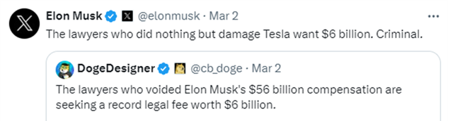 马斯克这才忍不住破防发文:一帮除了损害特斯拉啥也没干的律师,竟然敢要60亿美元,简直是犯罪!