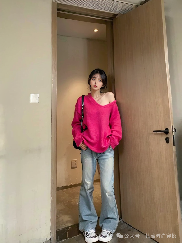 粉色的V领毛衣不仅显白,还能露出迷人的锁骨线条,让你在人群中脱颖而出。再看这条破洞牛仔裤,既保留了经典牛仔裤的复古感,又加入了现代的破洞元素,让整体造型更加时尚前卫。