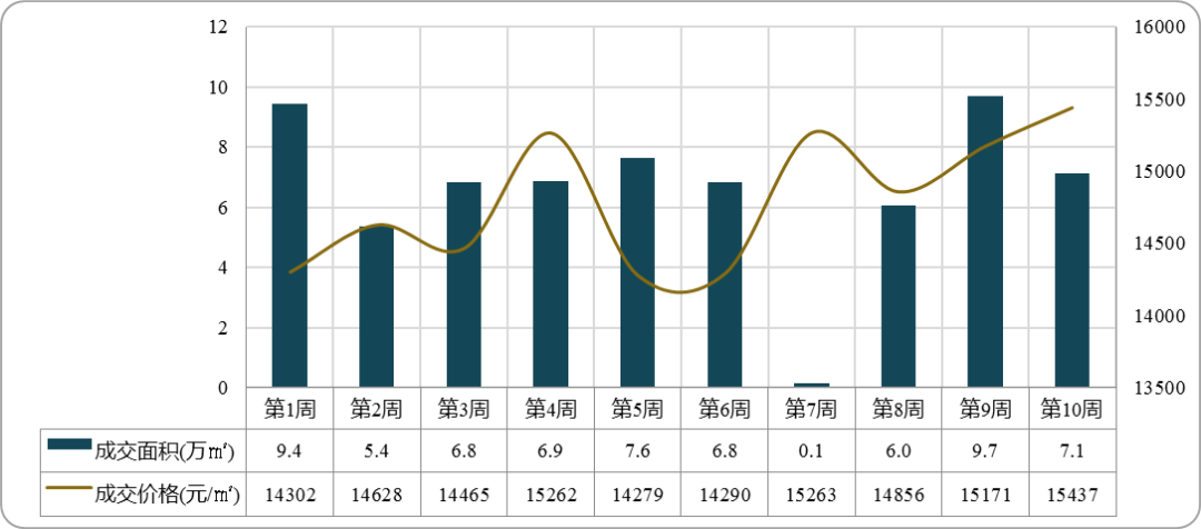 本周中心城区商品住宅成交量降价涨,商品住宅成交均价15437元/㎡,价格受改善产品成交持续上扬。