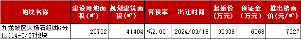本周重庆中心城区无住宅用地成交,于3月8日推出一宗住宅用地。地块位于九龙坡区大杨石组团,推出体量4.1万㎡,推出楼面均价7327元/㎡。