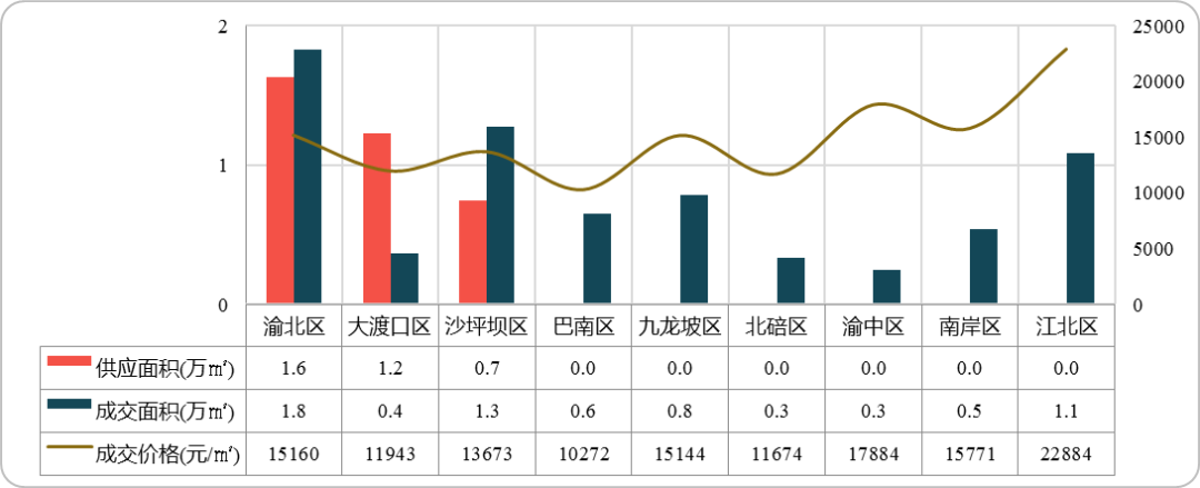 本周中心城区仅三区有商品住宅供应,分别是渝北区供应1.6万㎡,大渡口区供应1.2万㎡,沙坪坝区供应0.7万㎡。成交方面,渝北区住宅成交量以1.8万㎡领衔;沙坪坝区和江北区分别以1.3万㎡和1.1万㎡的商品住宅成交量位列二三;其余区域成交量均在1万㎡及以下。