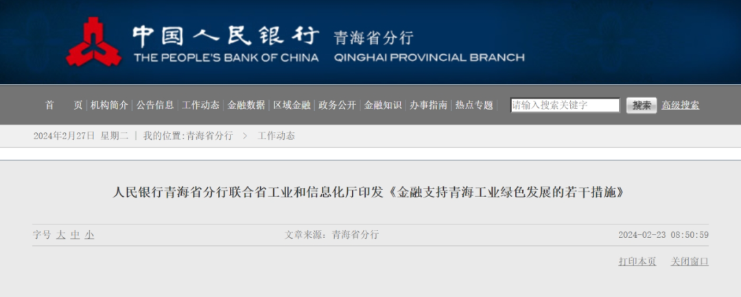 为深入践行党的二十大精神,落实中央金融工作会议和全国工业和信息化工作会议要求,以及省委、省政府有关碳达峰碳中和工作部署,引导金融资源为全省工业绿色发展提供精准支撑,助力生态文明高地建设,推进产业“四地”建设,人民银行青海省分行联合省工业和信息化厅印发《金融支持青海工业绿色发展的若干措施》,提出5方面12条具体举措,进一步提升绿色金融供给质效,推进新型工业化和现代化产业体系建设。
