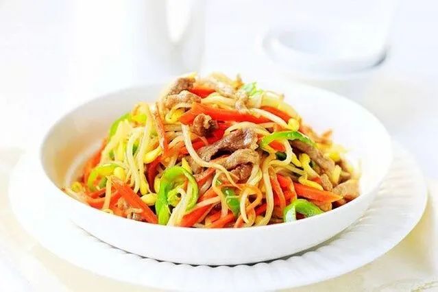 2.银芽炒肉(银芽:130克 肉丝:10克 胡萝卜:15克 韭菜:5.5克)