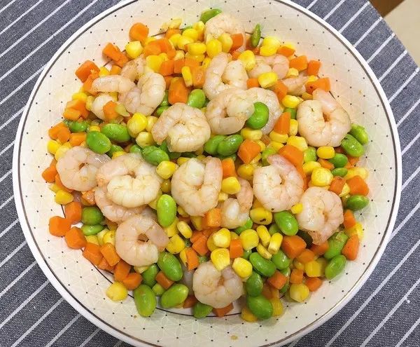 2.三色虾仁(鲜虾仁:35克 甜豆肉:35克 玉米粒:35克 胡萝卜:18克)