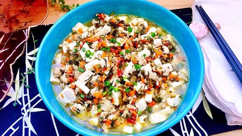 2.雪菜肉沫滚豆腐(老豆腐:100克 肉沫:5.5克 雪菜:10克)