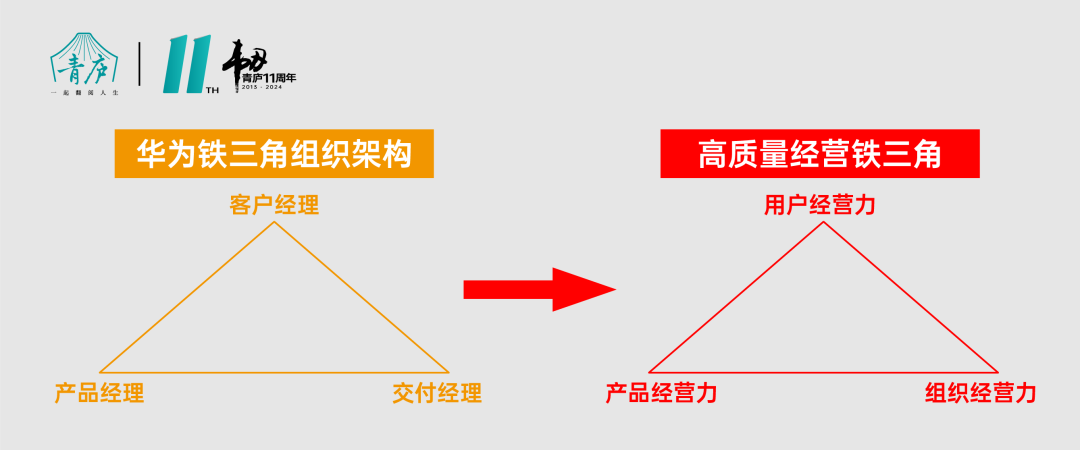 这也衍变成了一个高质量经营的“铁三角”模型:用户经营力+产品经营力+组织经营力。