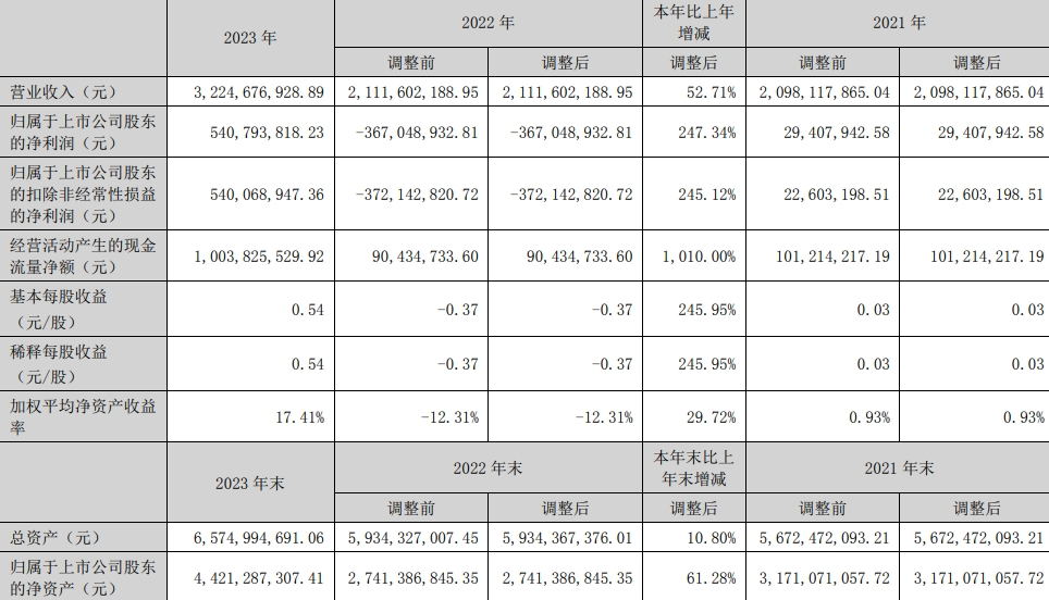3月6日晚间,益生股份发布2023年年报,公司全年实现营业收入32.25亿元,同比增长52.71%,实现净利润5.41亿元,同比扭亏为盈。