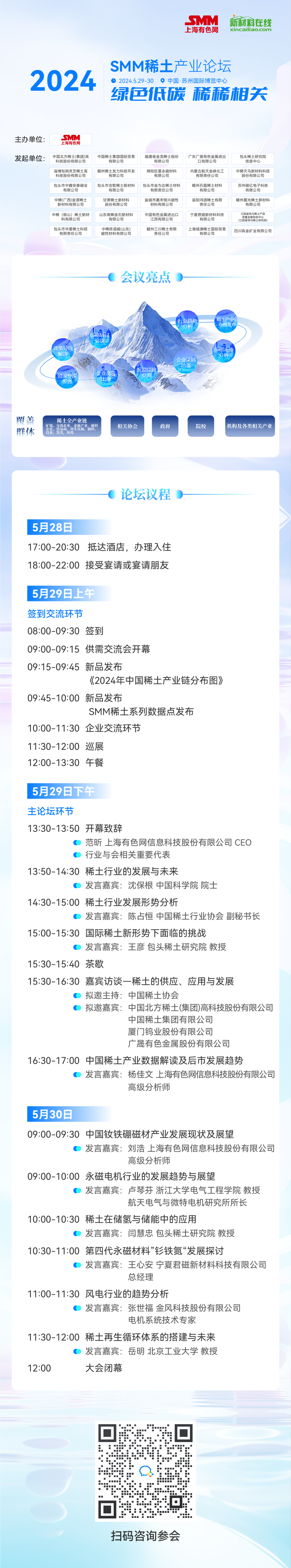 在此背景下,2024年5月29-30日,2024年SMM稀土产业论坛将举办,旨在提供一个稀土产业精英交流合作、共商行业发展大计的平台。