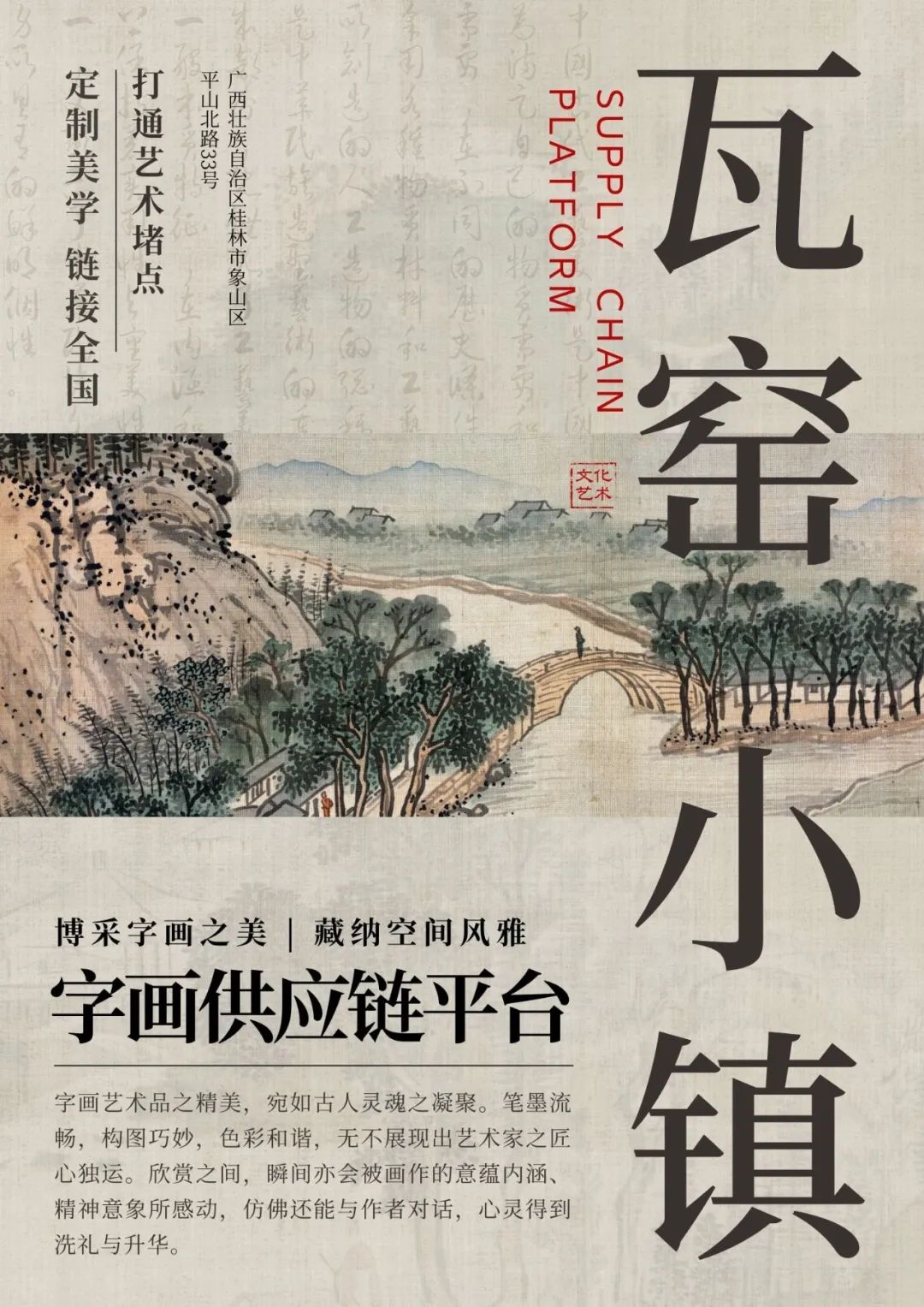 桂林·瓦窑小镇作为自治区文化产业示范园区、象山区重点建设的以体验非遗手工艺历史文化、“工匠精神”文化为主题的大型文化旅游综合体,为了让更多城市拥有引以为荣的文化品牌和尤为珍贵的文化底蕴,面向全国艺术家、配画师、空间使用者以及装饰装修领域专业人士等,输出定制化全品类一站式字画产品,共同构建供应链产业平台。