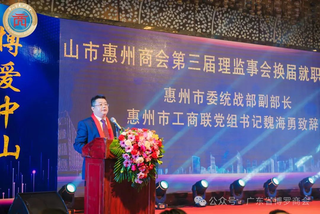 惠州市委统战部副部长、惠州市工商联党组书记魏海勇代表惠州市委市政府致辞。他说,商协会要提高政治站位,成立党支部,组织广大非公有制企业单位拥护中国共产党的领导,为国家经济高质量发展贡献力量,在提高新质生产力方面走在前列。
