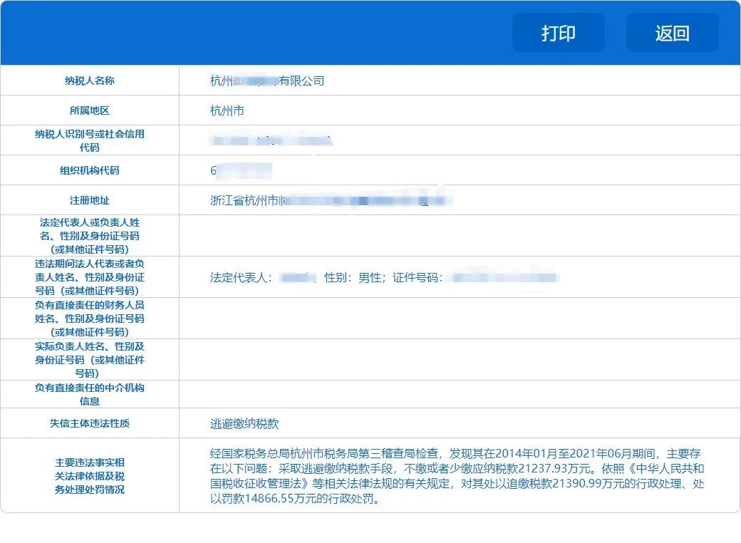 经国家税务总局杭州市税务局第三稽查局检查,发现其在2014年01月至2021年06月期间,主要存在以下问题:采取逃避缴纳税款手段,不缴或者少缴应纳税款21237.93万元。