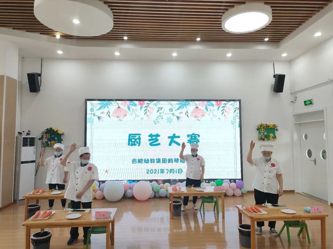 为提高炊事员业务技能,增强团队凝聚力,促进幼儿食物加工的精细化和规范化,从而更好地服务于幼儿。2021年7月1日下午,合肥幼教集团鹤琴幼儿园开展了“夏沁味蕾,美好食光伴成长”食堂人员厨艺大赛。
