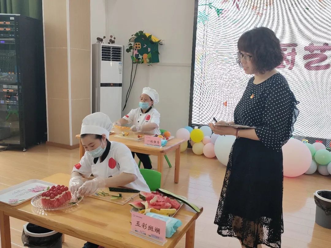 本次厨艺大赛分为刀工大比拼和厨艺大创新两项内容,厨房4名炊事员参赛,鹤琴幼儿园园长费广萍,副园长张玲玲、程玉梅,团支部书记刘杰玉老师担任评委。