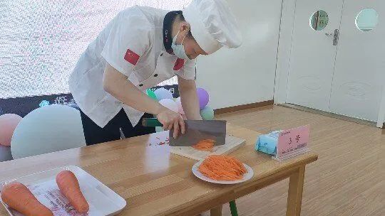 主持人“开始”的口令一发出,便传来齐刷刷的菜刀轻叩菜板的声音。短短几分钟便完成了操作,充分展示了扎实的刀工技能。