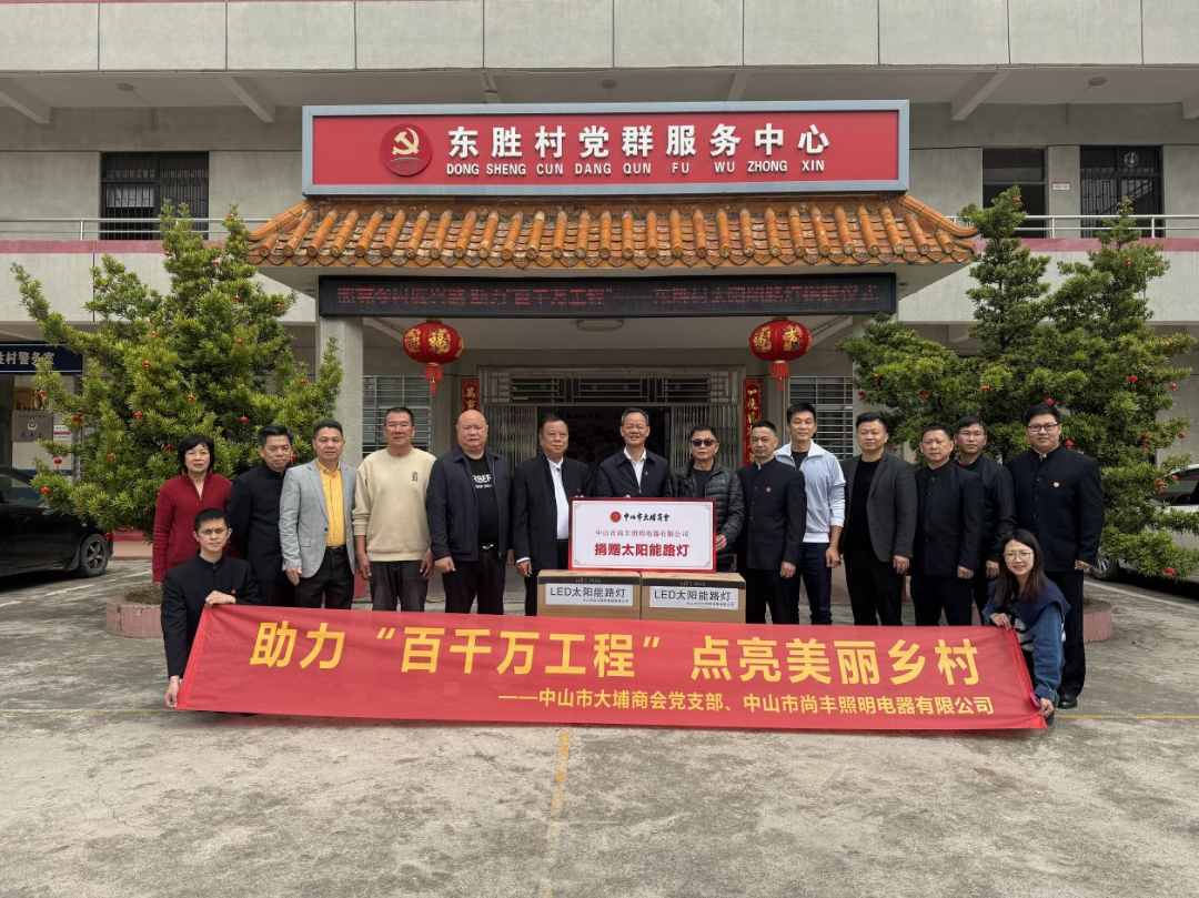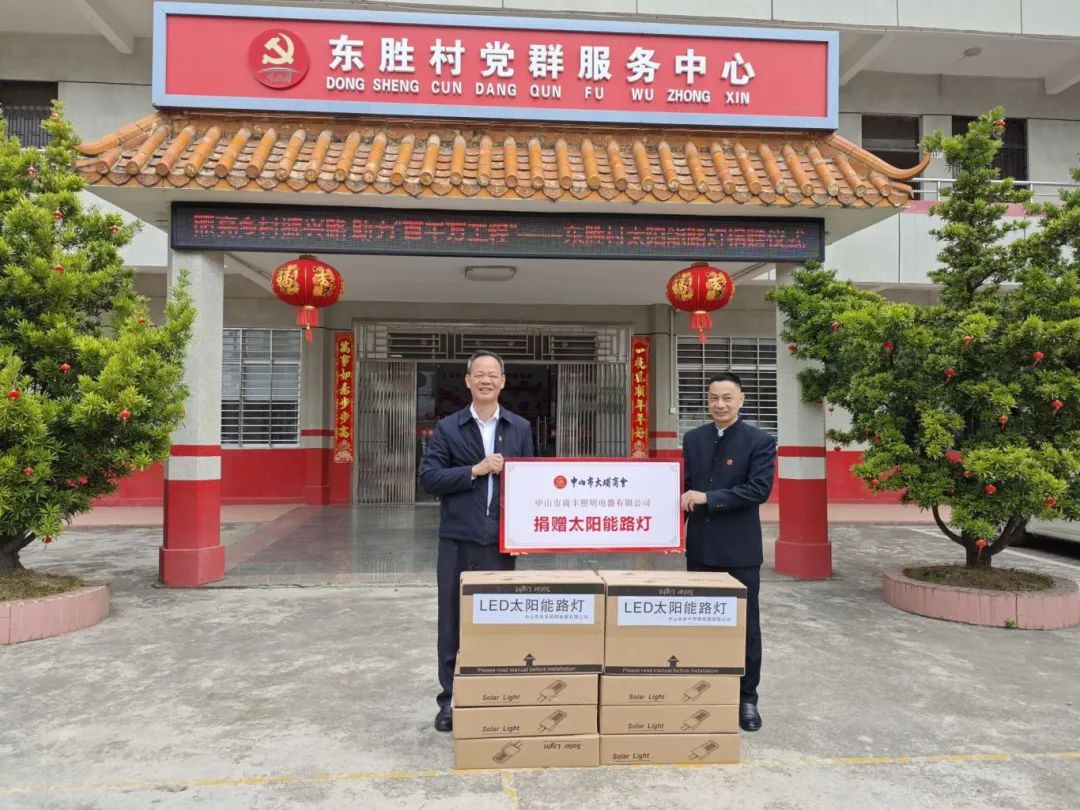 座谈会结束后,中山市大埔商会、中山市尚丰照明电器有限公司向东胜村捐赠了一批太阳能路灯,价值约6000元,为点亮乡村振兴路贡献力量!