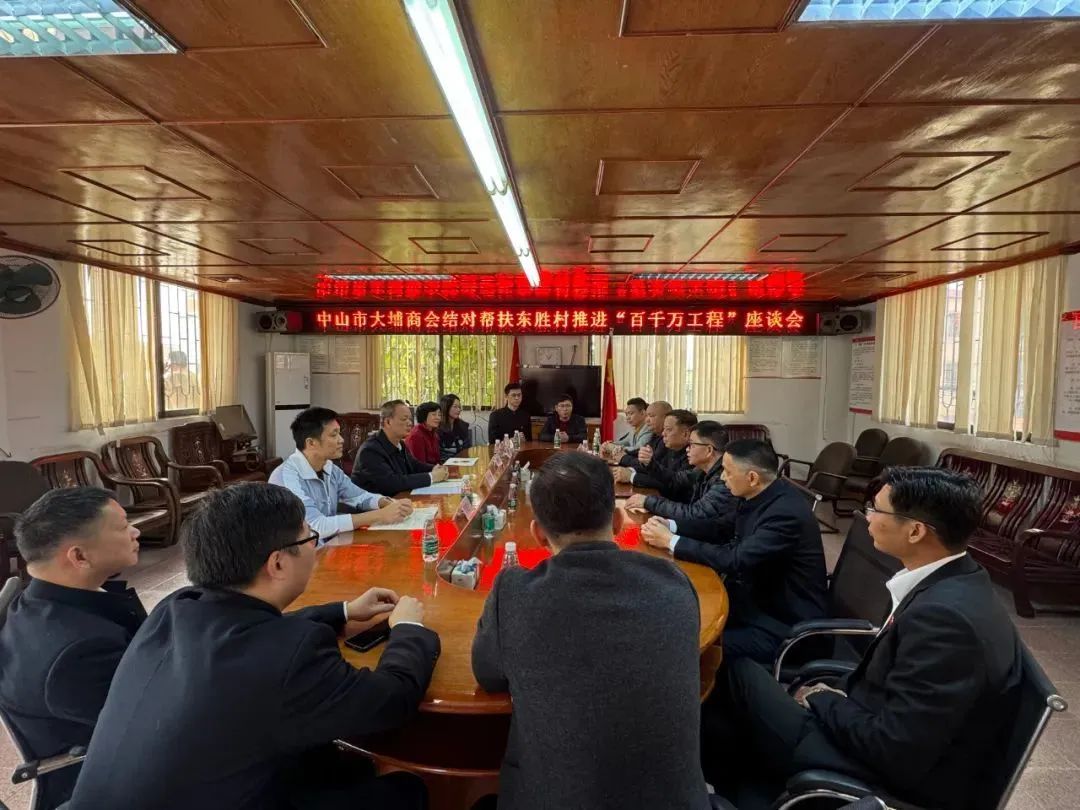 3月8日上午,中山市大埔商会会长罗为礼、党支部书记李业淳一行来到东胜村开展结对帮扶“百千万工程”座谈会,与东胜村“两委”干部进行了深入的交流。