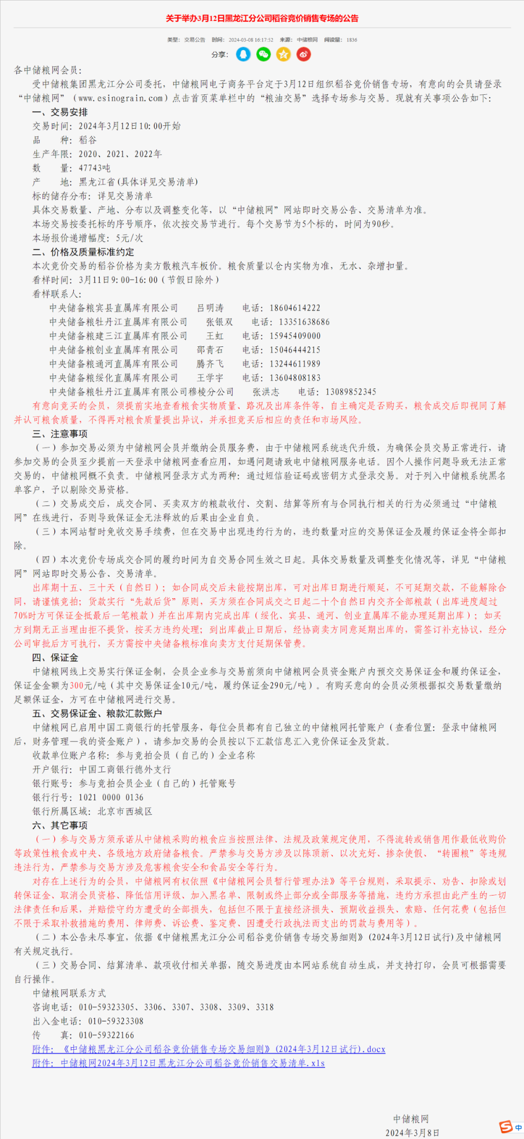 关于举办3月12日黑龙江分公司稻谷竞价销售专场的公告