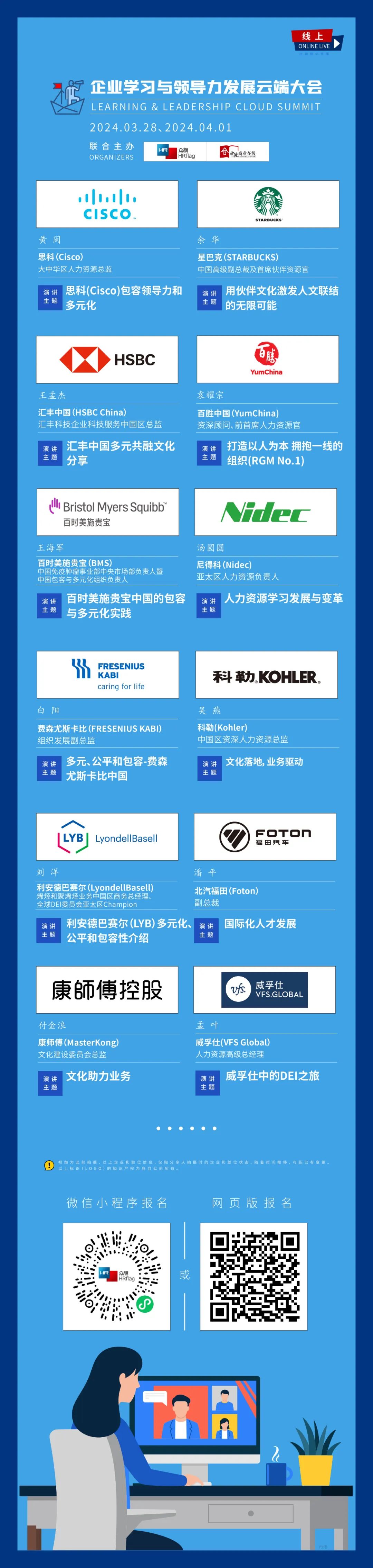 03月28日-04月01日,由中国领先的人力资源管理智库-HRflag和中国管理与领导力在线学习引领者中欧商业在线(CEIBS Business Online)联合主办的企业学习与领导力发展云端大会即将重磅开启!思科(Cisco)、星巴克(STARBUCKS)、汇丰中国(HSBC China)、 百胜中国(YumChina)、百时美施贵宝(BMS)、尼得科(Nidec)、费森尤斯卡比(FRESENIUS KABI)、科勒(Kohler)、利安德巴赛尔(LyondellBasell)、北汽福田(Foton)、康师傅(MasterKong)、威孚仕(VFS Global)等全球及中国领先企业的人力资源高管、学习与领导力专家将围绕企业学习与领导力发展的热点话题,探讨人力资源管理的变革与挑战,为广大人力资源从业者带来全新启迪!